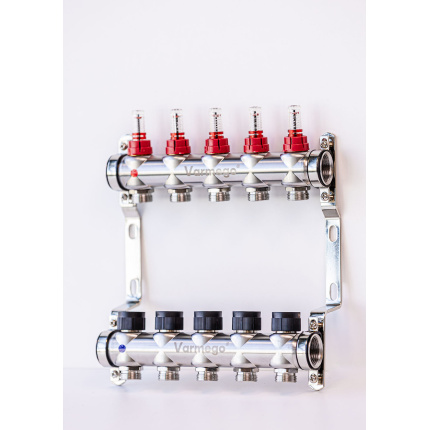 Varmego ® Razdelnik&Sabirnik INOX 304 BAMBOO-Priključak napajanja 1ˮ-Priključak razvoda 3/4ˮ [Merač protoka 0-5L/min+Termostataski ventil] Sa nosačem/5 grejna kruga