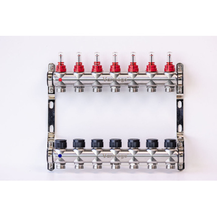 Varmego ® Razdelnik&Sabirnik INOX 304 BAMBOO-Priključak napajanja 1ˮ-Priključak razvoda 3/4ˮ [Merač protoka 0-5L/min+Termostataski ventil] Sa nosačem/7 grejna kruga
