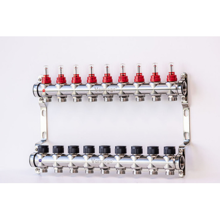 Varmego ® Razdelnik&Sabirnik INOX 304 FLAT-Priključak napajanja 1ˮ-Priključak razvoda 3/4ˮ [Kugla ventil+Kugla ventil] Sa nosačem-10 grejna kruga
