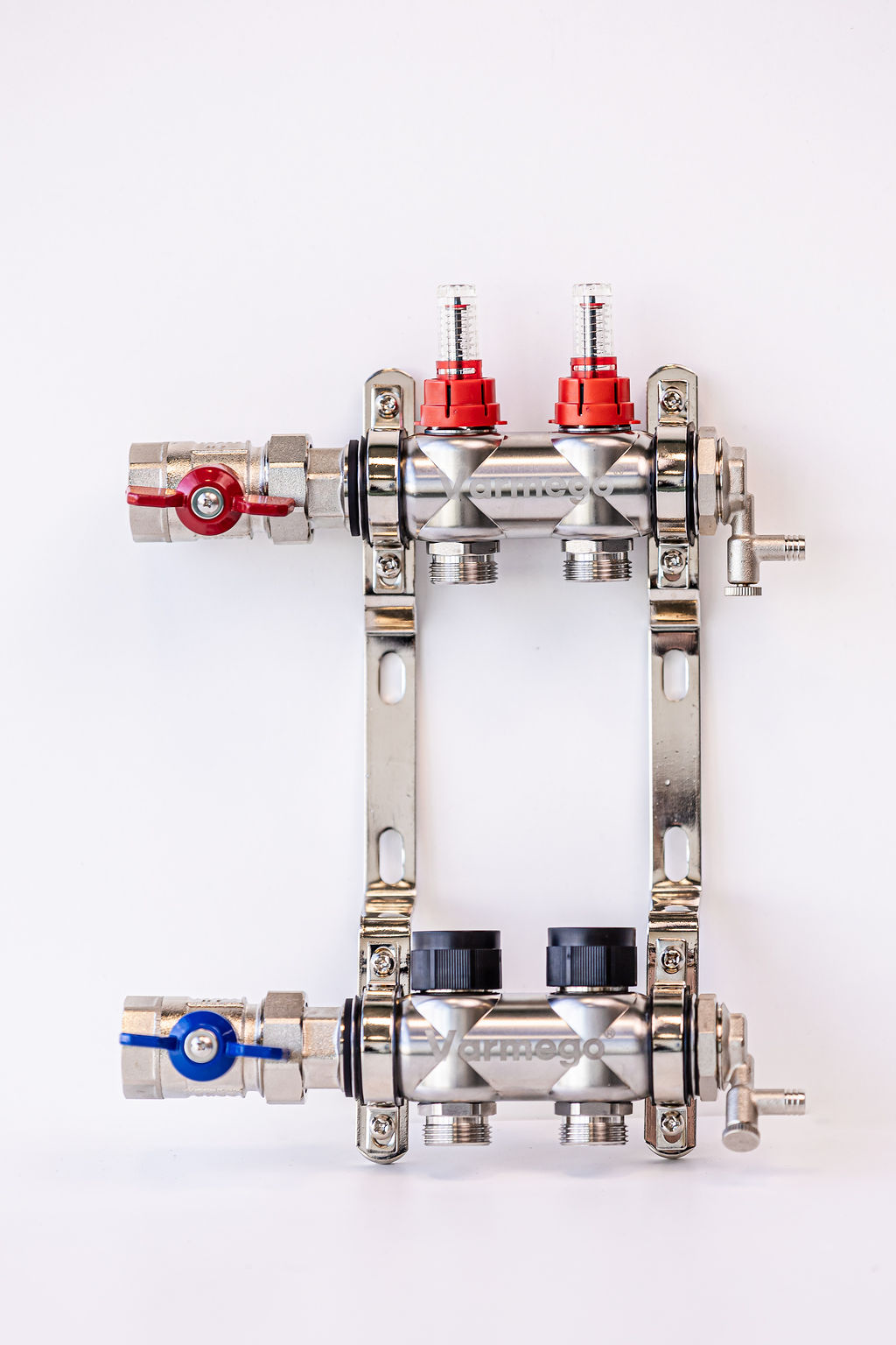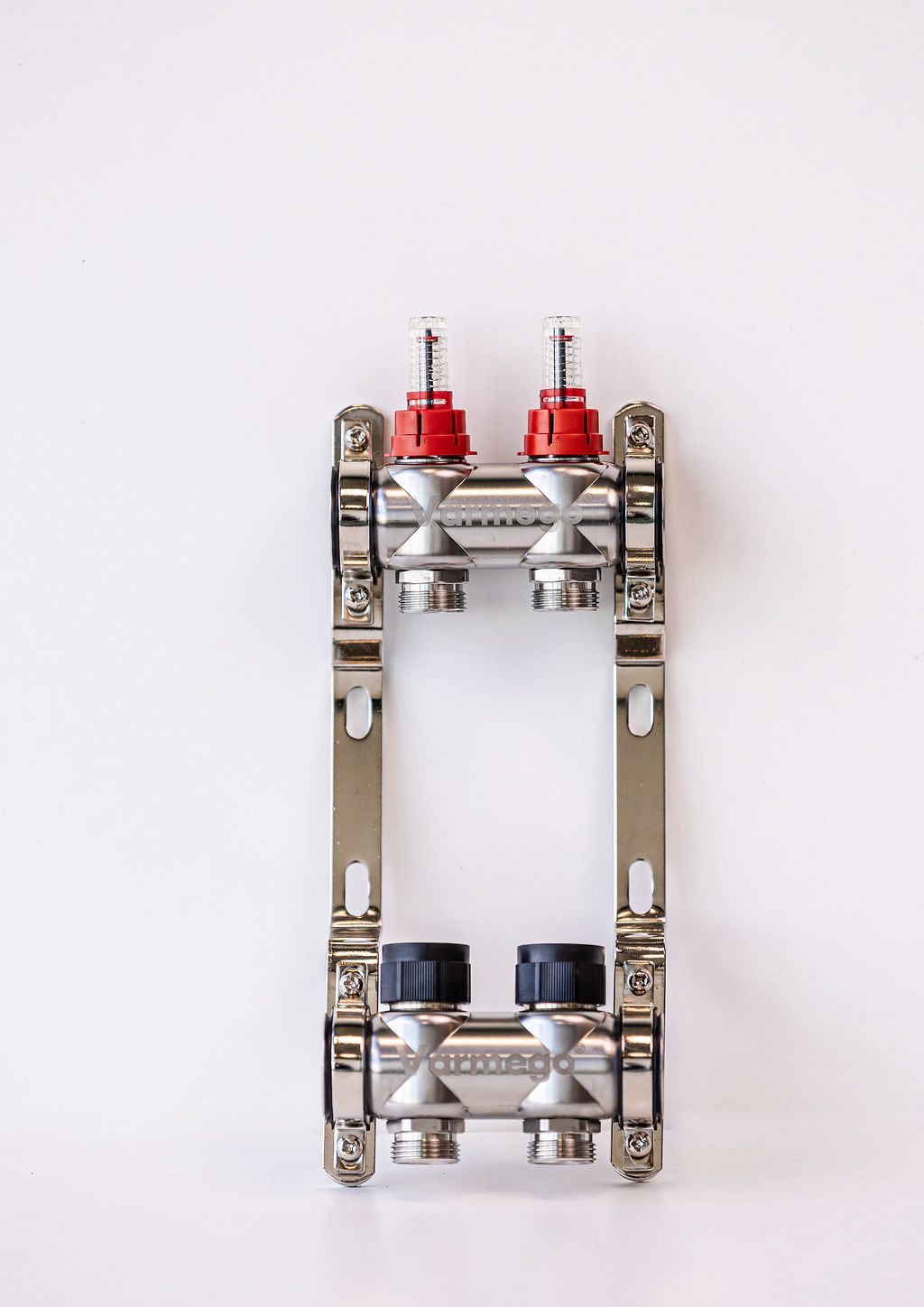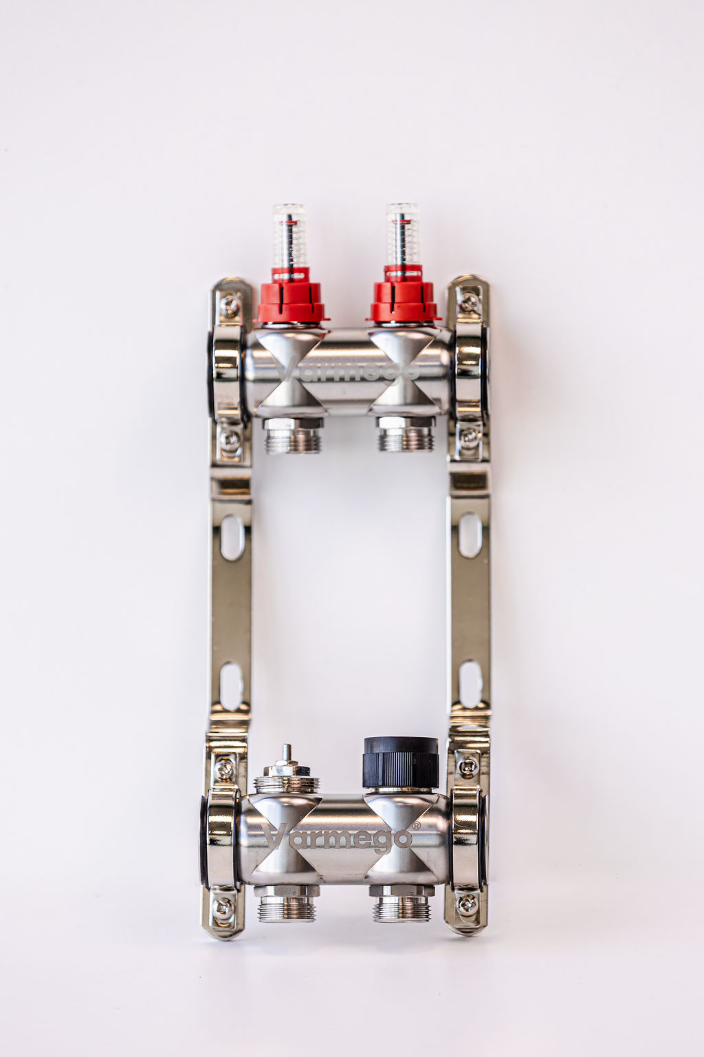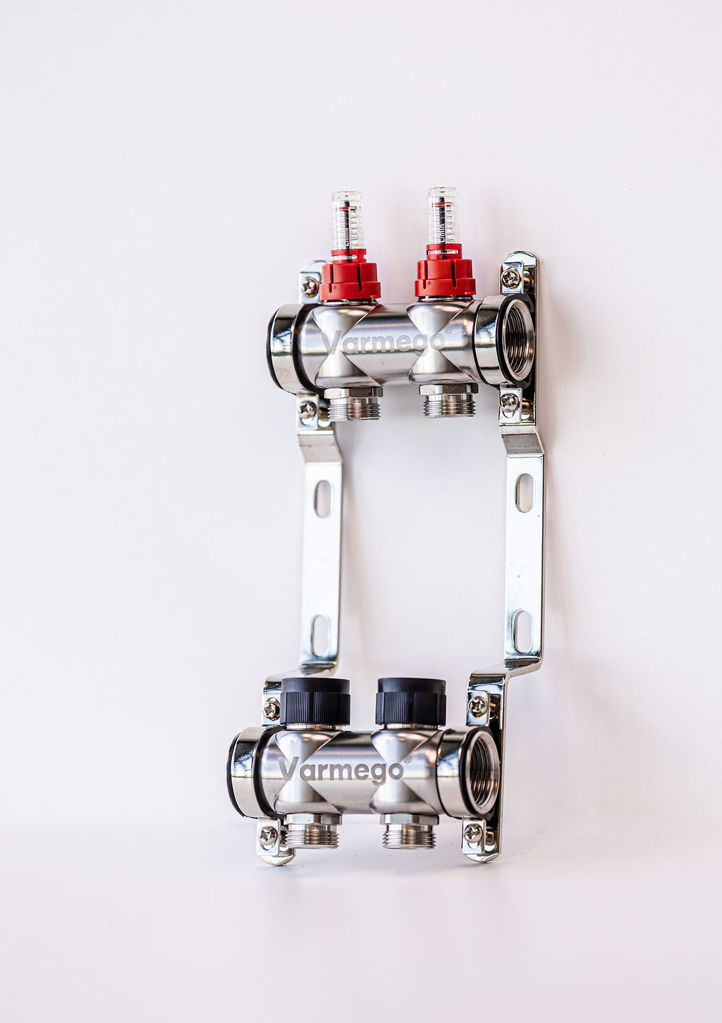 Varmego ® Razdelnik&Sabirnik INOX 304 BAMBOO-Priključak napajanja 1ˮ-Priključak razvoda 3/4ˮ [Merač protoka 0-5L/min+Termostataski ventil] Sa nosačem/2 grejna kruga