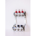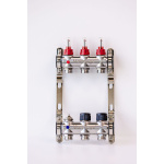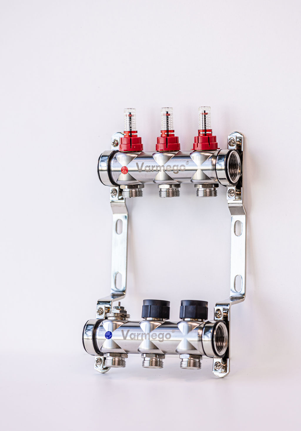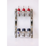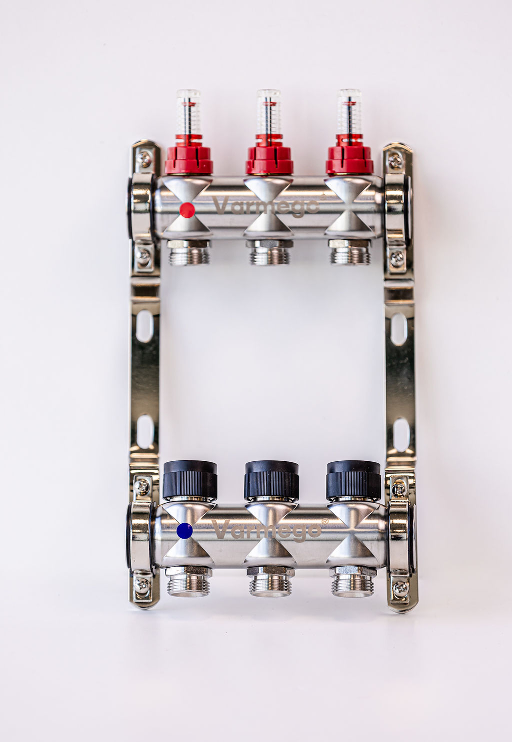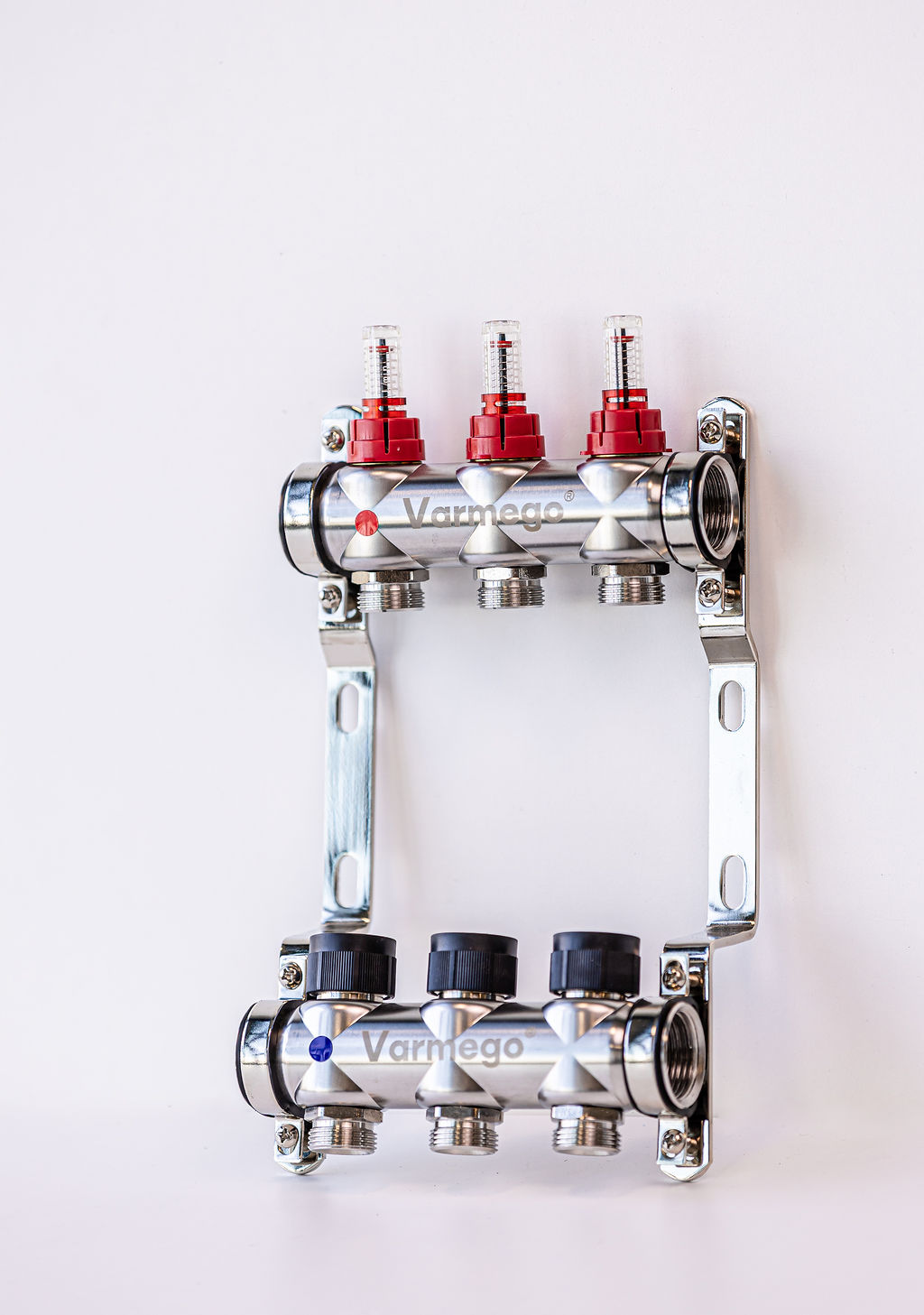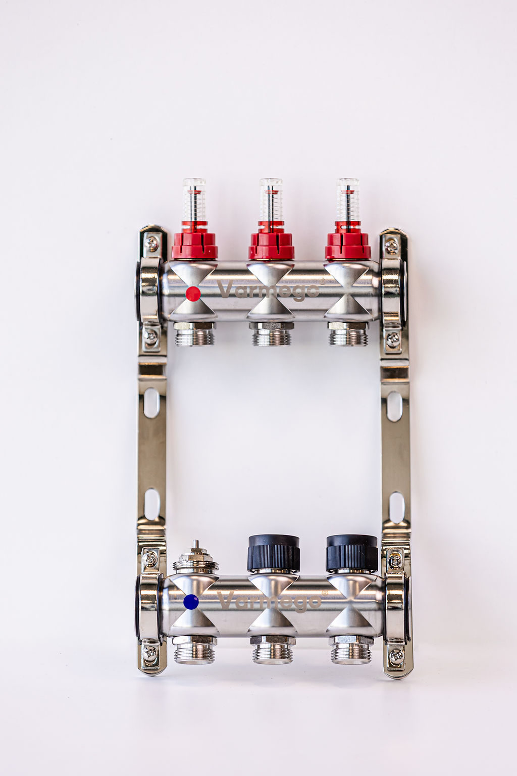 Varmego ® Razdelnik&Sabirnik INOX 304 BAMBOO-Priključak napajanja 1ˮ-Priključak razvoda 3/4ˮ [Merač protoka 0-5L/min+Termostataski ventil] Sa nosačem/3 grejna kruga
