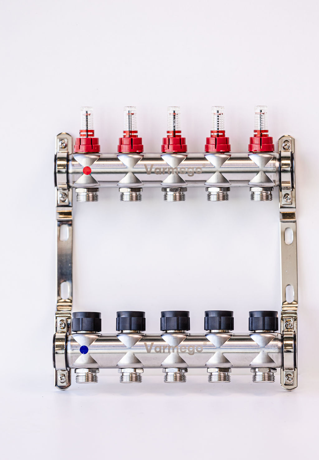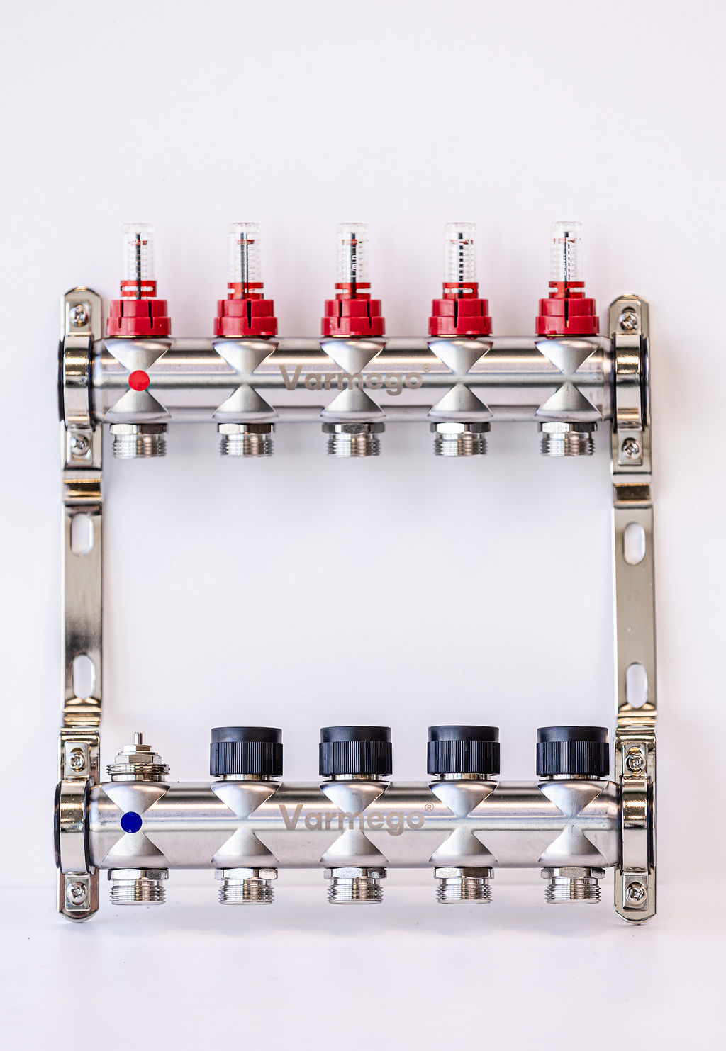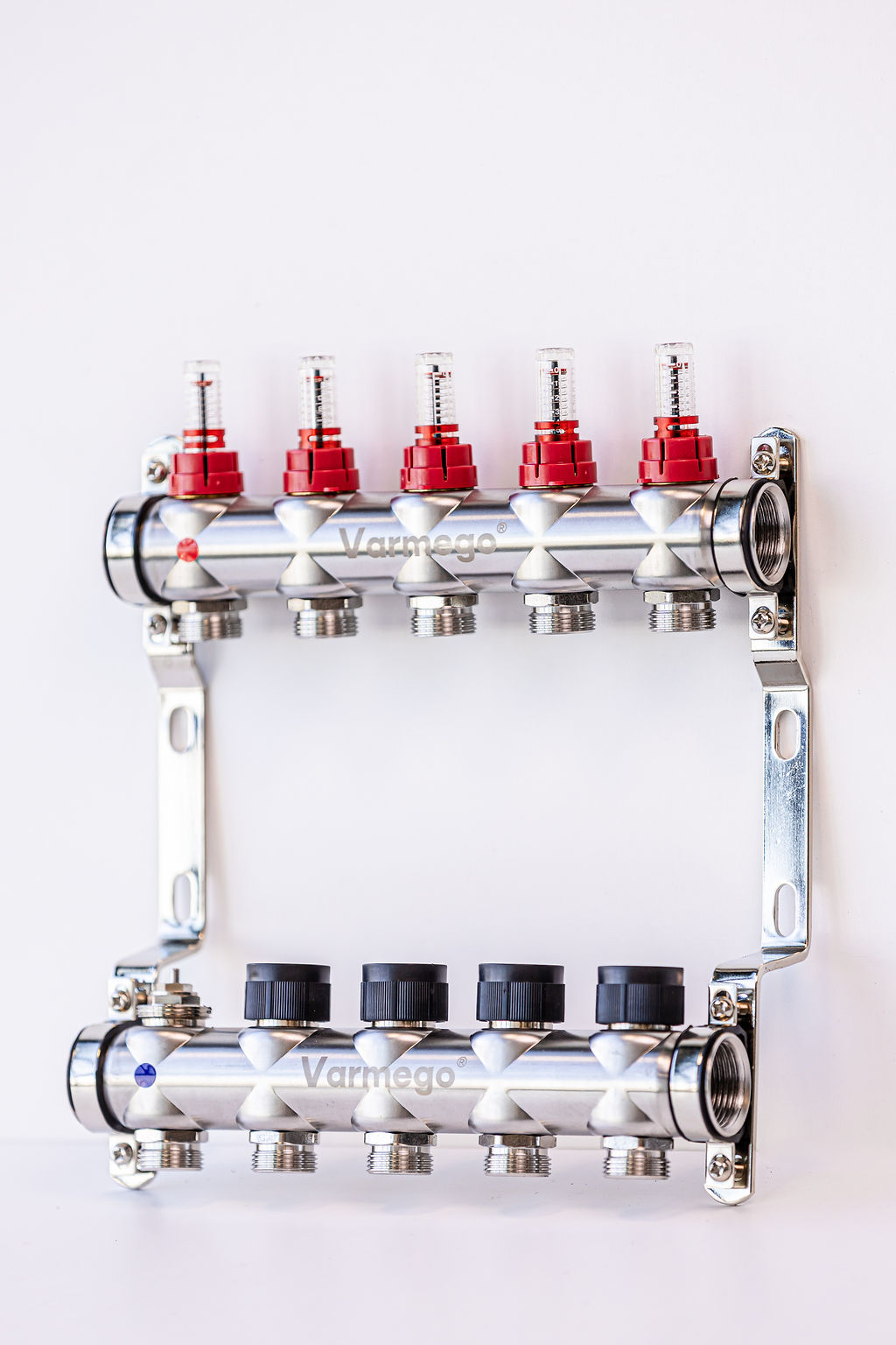 Varmego ® Razdelnik&Sabirnik INOX 304 BAMBOO-Priključak napajanja 1ˮ-Priključak razvoda 3/4ˮ [Merač protoka 0-5L/min+Termostataski ventil] Sa nosačem/5 grejna kruga