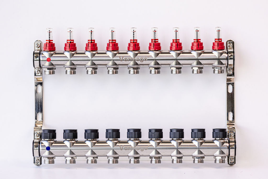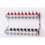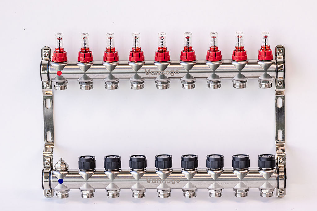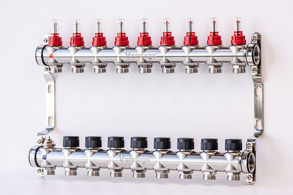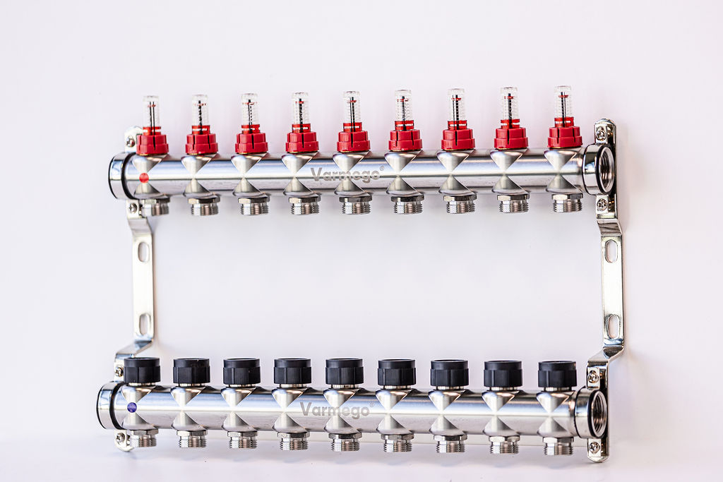 Varmego ® Razdelnik&Sabirnik INOX 304 BAMBOO-Priključak napajanja 1ˮ-Priključak razvoda 3/4ˮ [Merač protoka 0-5L/min+Termostataski ventil] Sa nosačem/9 grejna kruga