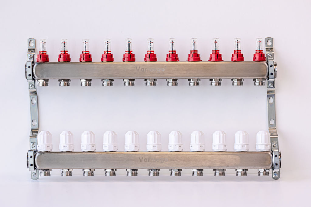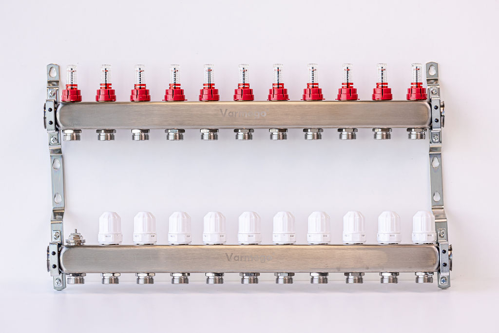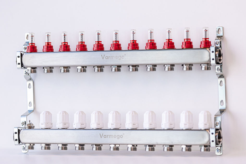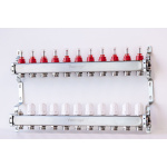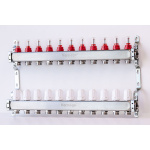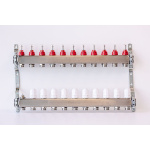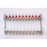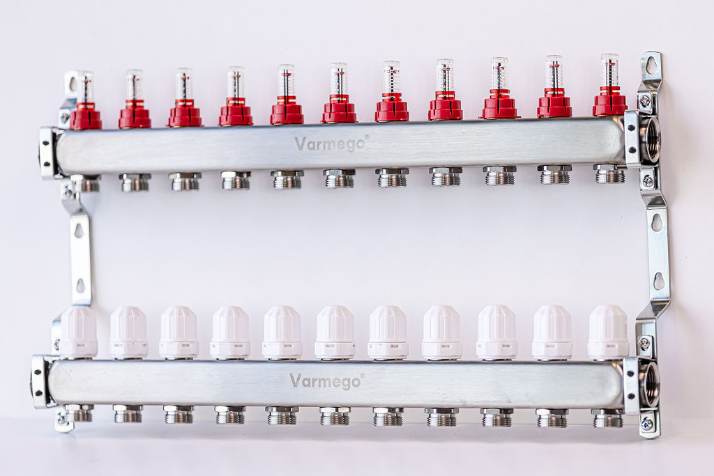 Varmego ® Razdelnik&Sabirnik INOX 304 FLAT-Priključak napajanja 1ˮ-Priključak razvoda 3/4ˮ [Merač protoka 0-5L/min+Termostataski ventil] Sa nosačem-11 grejnih krugova