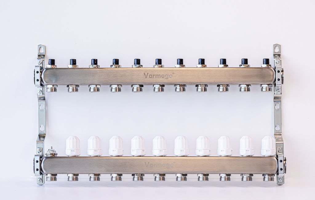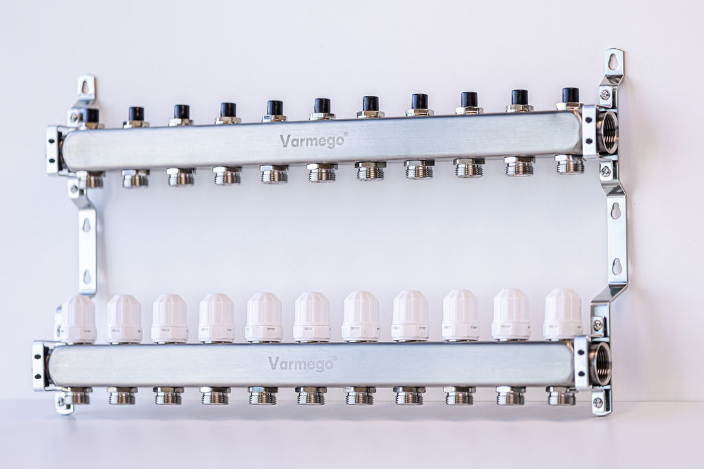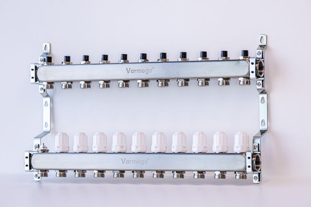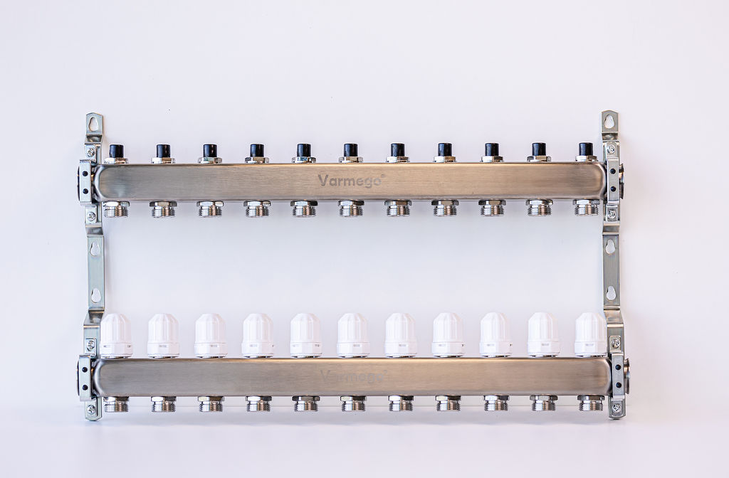 Varmego ® Razdelnik&Sabirnik INOX 304 FLAT-Priključak napajanja 1ˮ-Priključak razvoda 3/4ˮ [Stop ventil+Termostataski ventil] Sa nosačem-11 grejna kruga