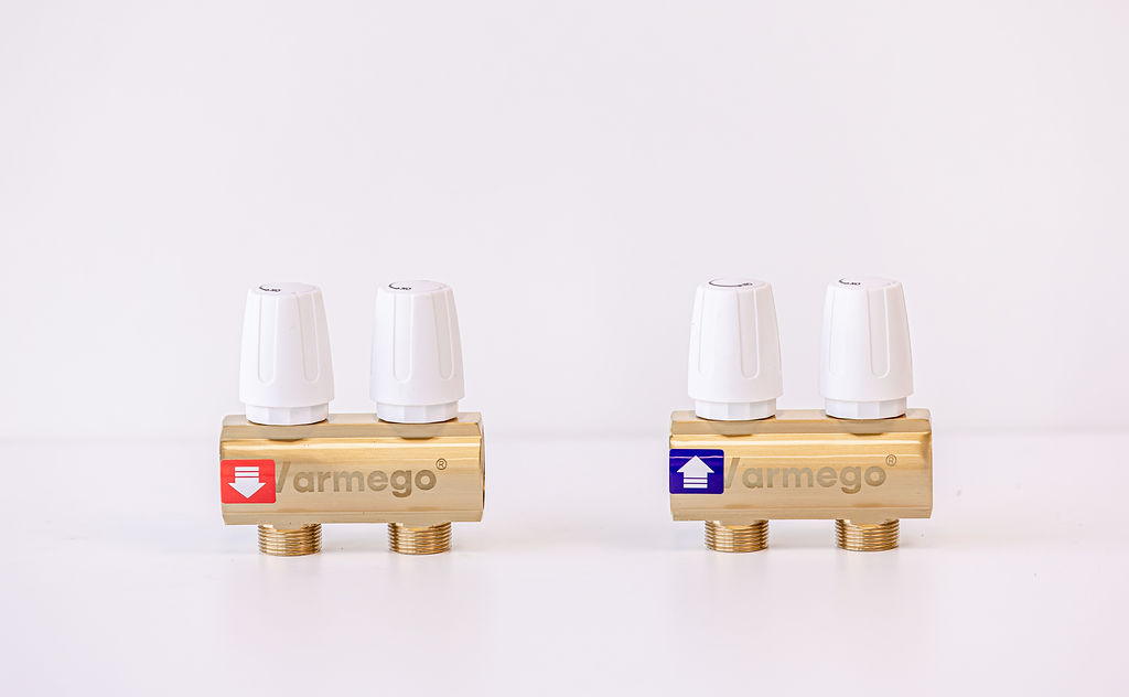 Varmego ® Razdelnik&Sabirnik MESING-Priključak napajanja 1ˮ-Priključak razvoda 3/4ˮ [Stop ventil+Stop ventil] Sa nosačem-2 grejna kruga